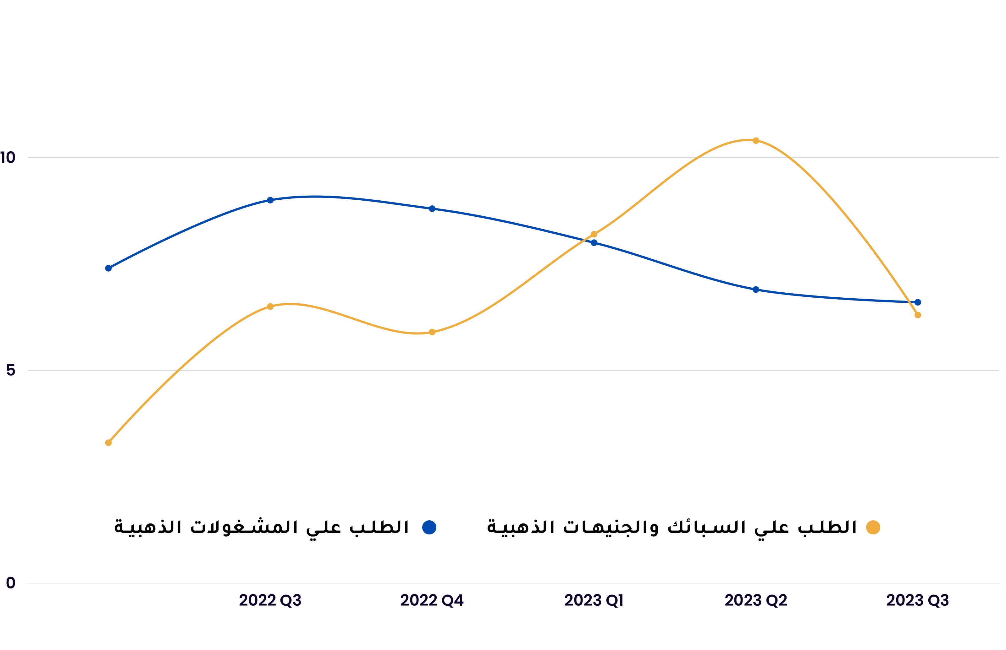 و بالنظر الي معدلات الطلب علي المشغولات علي مدار الثلاث ارباع للعام السابق و مقارنتها بنفس الفتره من العام الجاري سنجد ان الطلب علي المشغولات تراجع بنسبه 14.6 % وذلك يوحي بزياده الوعي الاستثماري في السوق المصري .