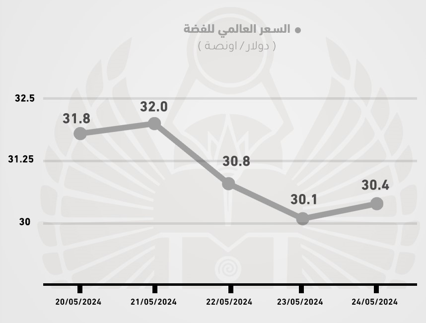 ارتفعت أسعار عقود الفضة الفورية بنسبة 0.7% لتغلق عند 30.3 دولار للأونصة مقابل 31.4 دولار الأسبوع الماضي، وسجلت عقود تسليم يوليو نحو 30.5 دولار للأونصة بنهاية التداولات الأسبوعية.