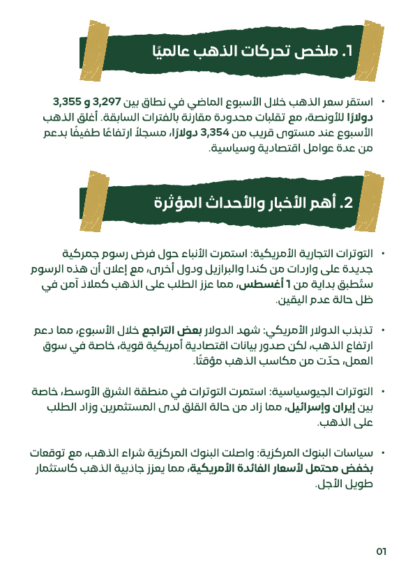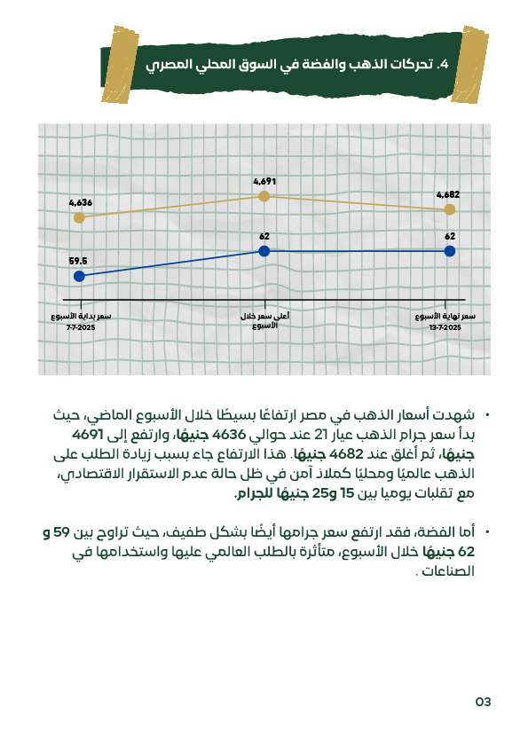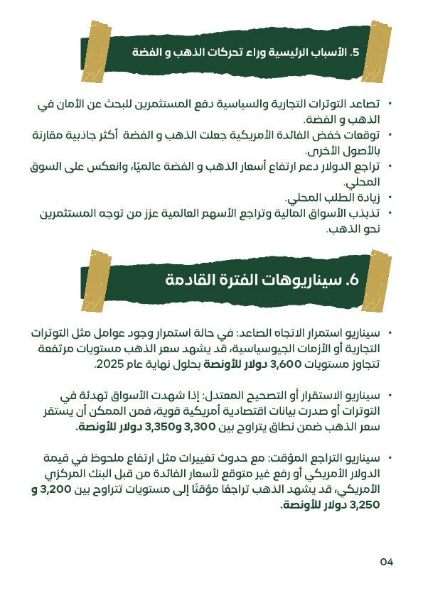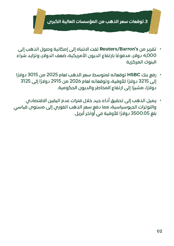 أشارت توقعات عدد من المؤسسات المالية الكبرى إلى احتمالية استمرار الارتفاع في أسعار الذهب خلال الفترة القادمة، وذلك في حال استمرار الأزمات الجيوسياسية والضغوط الاقتصادية العالمية. وقد قامت مؤسسة "إتش إس بي سي" برفع توقعاتها لمتوسط سعر الذهب لعام 2025 إلى 3,215 دولارًا للأونصة، في ظل تزايد معدلات الدين الحكومي وتراجع الثقة في الدولار، بالإضافة إلى اتجاه البنوك المركزية العالمية إلى زيادة احتياطاتها من الذهب. كما توقعت تقارير دولية أن يصل سعر الذهب إلى مستويات قد تتجاوز 4,000 دولار في حال تصاعدت الأزمات العالمية. أما في حال حدوث تهدئة نسبية في الأوضاع الاقتصادية وصدور بيانات قوية من الاقتصاد الأمريكي، فقد يستقر سعر الذهب بين 3,300 و3,350 دولارًا. وفي حال شهد الدولار الأمريكي ارتفاعًا قويًا أو قامت البنوك المركزية برفع أسعار الفائدة بشكل مفاجئ، فقد يتراجع الذهب بشكل مؤقت إلى مستويات تتراوح بين 3,200 و3,250 دولارًا. أما في السوق المحلي المصري، فإن ارتفاع الطلب الداخلي إلى جانب تأثر السوق بالعوامل العالمية قد يستمر في دعم أسعار الذهب والفضة، مما يستدعي من المستثمرين متابعة المؤشرات العالمية والمحلية باستمرار. ونوصي دائمًا باستشارة مختص مالي قبل اتخاذ أي قرار استثماري